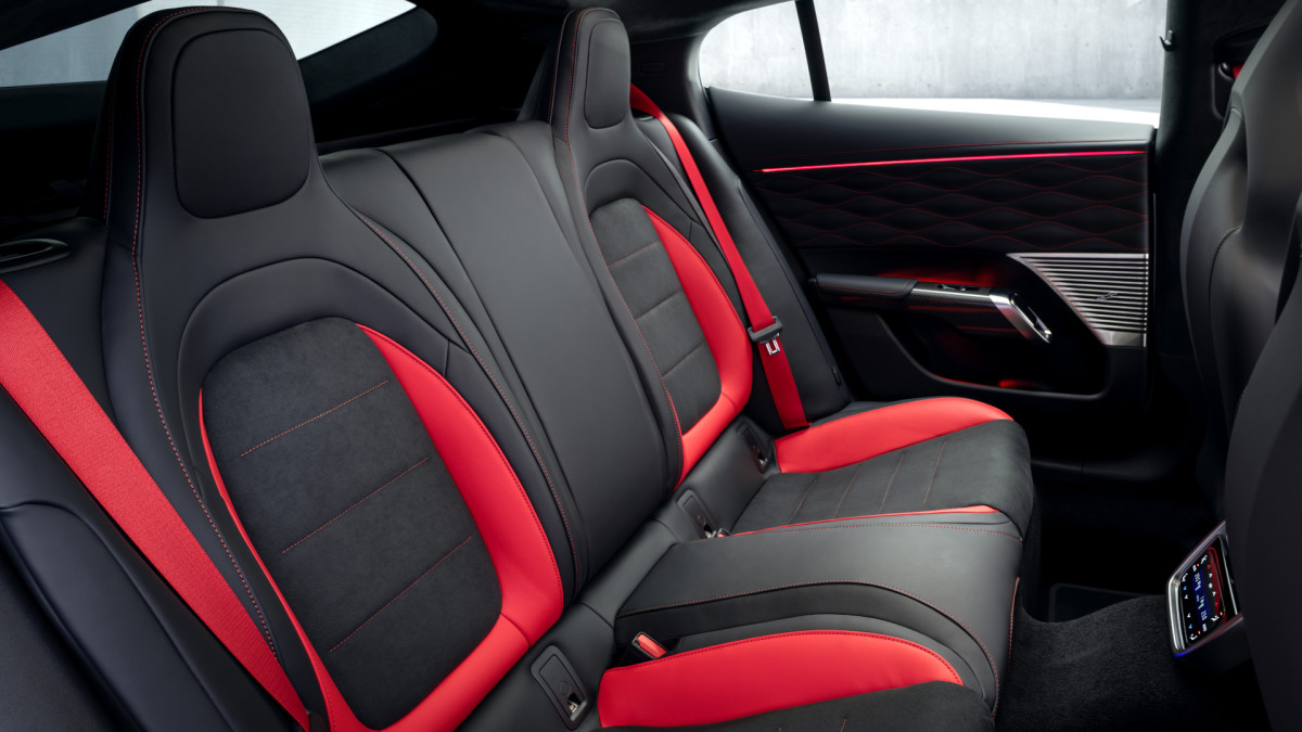 Desde os bancos dianteiros padrão voltados para o conforto ou os bancos AMG Performance opcionais retratados aqui, a abundância de iluminação ambiente banha a cabine com um brilho quente de cores, que pode ser modificado; você não precisa se limitar ao vermelho e ao preto, e isso também se aplica aos próprios bancos, que estarão disponíveis em várias cores, incluindo diversas opções Manufaktur Exclusive. O mesmo vale para os cintos de segurança. Os poleiros traseiros também estão disponíveis em duas configurações, com dois assentos individuais como padrão ou um banco de três lugares como opção. De qualquer forma, os encostos traseiros rebatem-se e, atrás dos bancos dianteiros, as reentrâncias no piso oferecem mais espaço para as pernas. A capacidade de carga ainda não foi anunciada, então provavelmente não é imensa. Afinal, as baterias ocupam espaço.